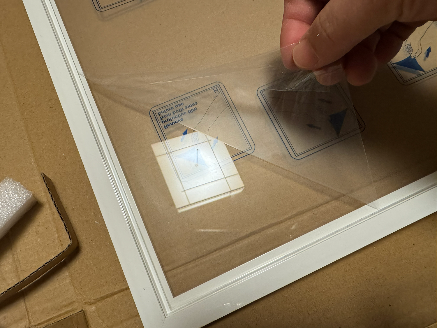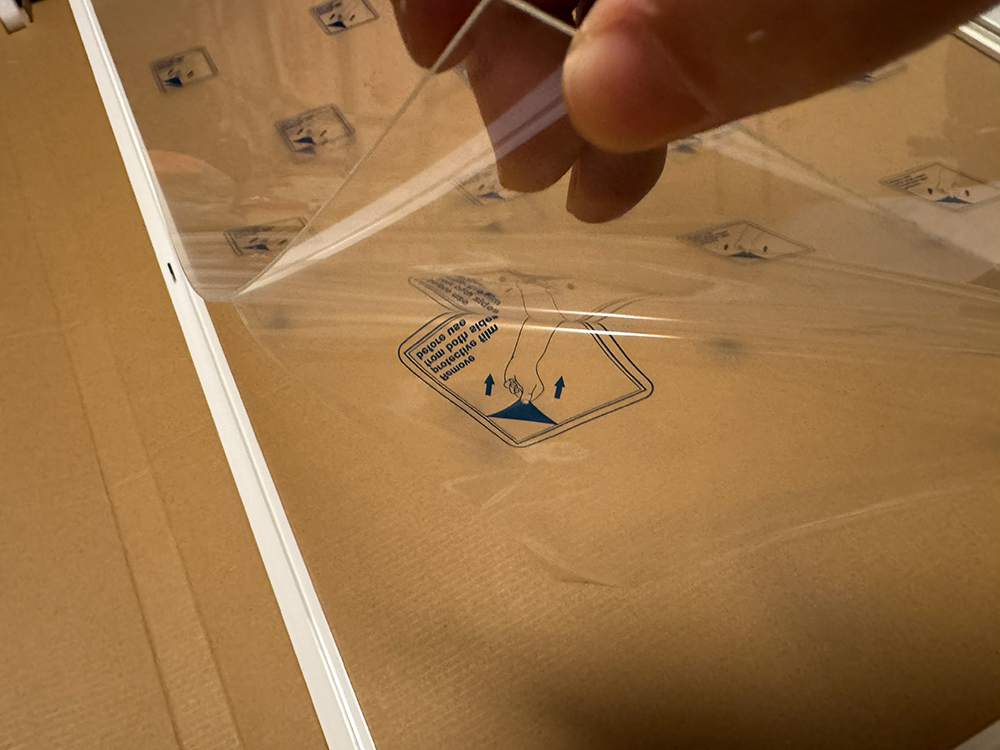 アクリルパネルには、傷防止のために両面にフィルムが貼られています。これを丁寧に剥がすと、クリアな表面が現れます。